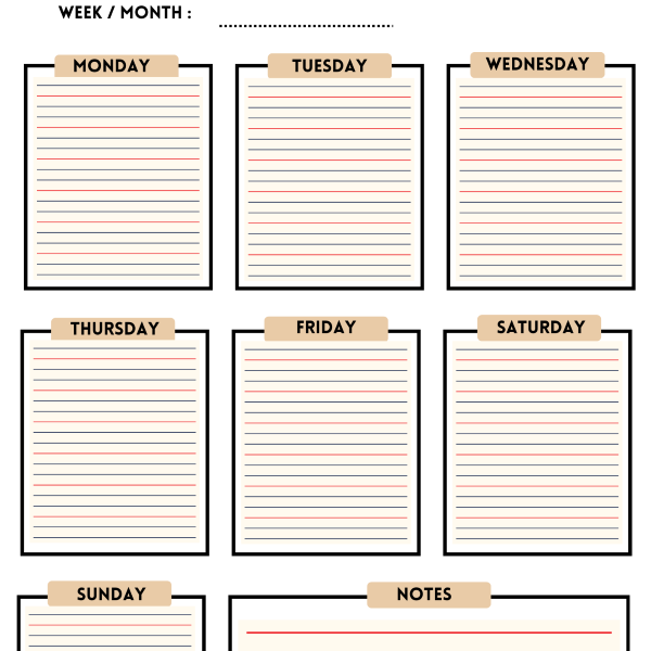 Elevate your workweek with our Office Minimal Weekly Planner in a sleek beige and black palette. Its professional layout, aesthetic design, and ruled lines offer a neat and clean canvas, enhancing organization for a modern and efficient planning experience, perfectly tailored to your office needs.